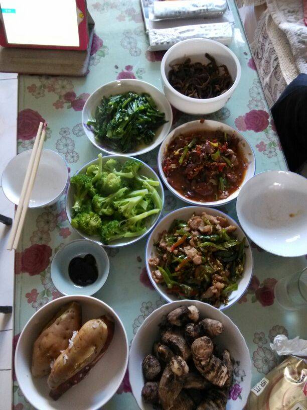 青椒炒肉,炒猪血,清炒莴笋叶,清蒸西兰花,吃了红薯和芋头,没吃米饭。从生病以后吃的都比较清淡,老公受不了了,今天中午狠狠的炒了个青椒炒肉,还喝点小酒。真是辛苦他了