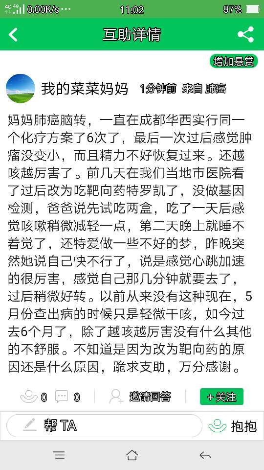 你妈妈和我妈妈一个月份发现的我妈也是肺癌脑转,你去当地医院内科看看是不是电解质紊乱,我妈前几天缺钾就是吃不下饭精神恍惚