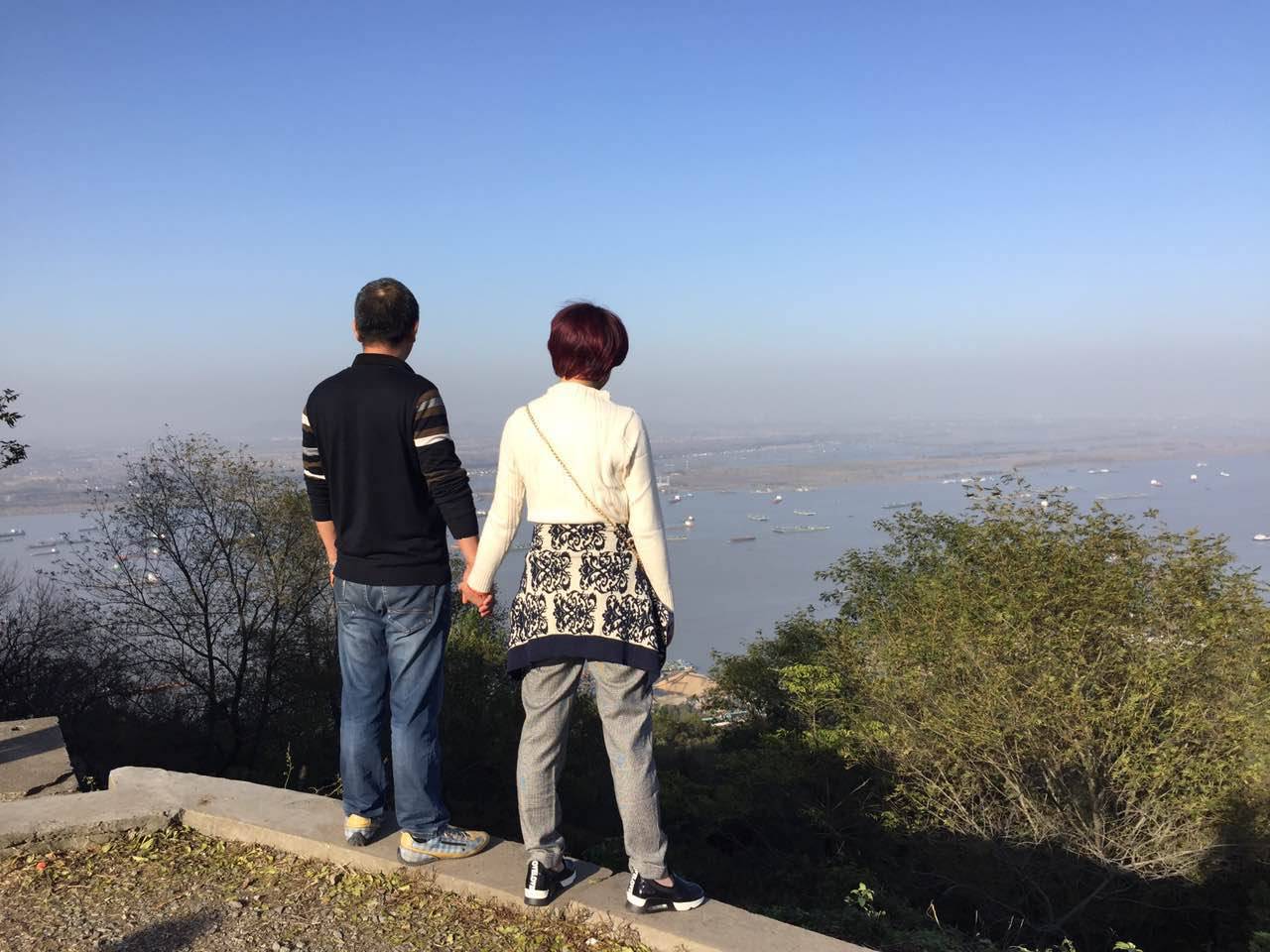 ,还是来早了,红枫叶不是太多,听人家说元旦前一周来枫叶基本都红了!不过我的主要目的是爬山,所以一点不影响我的心情,我们一边享受大自然带来的美景,一边享受着阳光的沐浴向上前进,老公不时问我行不行啊?我笑着说,你看你都喘了我还没喘呢!不知不觉到了山顶!我说 来留影一张,栖霞山在我们脚下哦