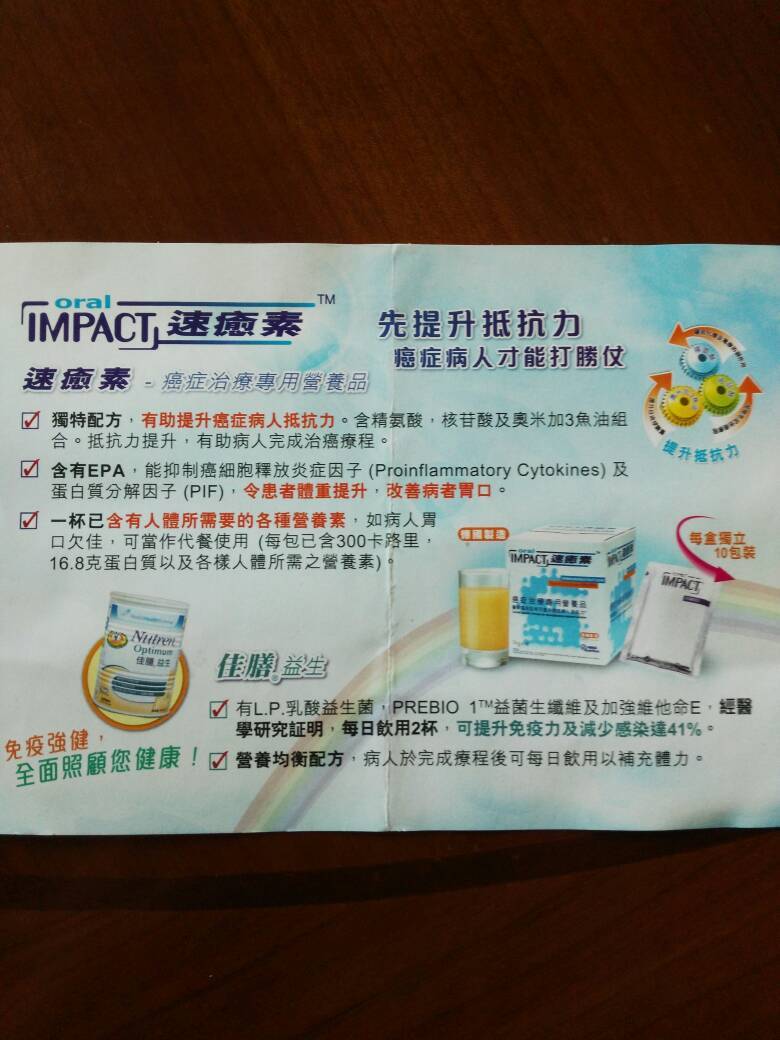 像奶粉一样冲着喝的,有水果味,是化疗期间反应大吃不下东西的时候可能喝它补充营养,如果吃的下我觉得还是食补好一些,那个甜得有点腻,反正我喝不惯