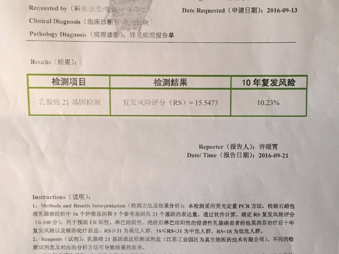 谢谢哦,又增长知识了,我是第一次了解这个21基因检测的,从来没有医生告诉过我,我也是激素受阳体,淋巴结阴性,肿块是3✘2✘1㎝,也符合做这个检测的要求,现在说什么也晚了,已经是挣扎到最后一次化疗了,