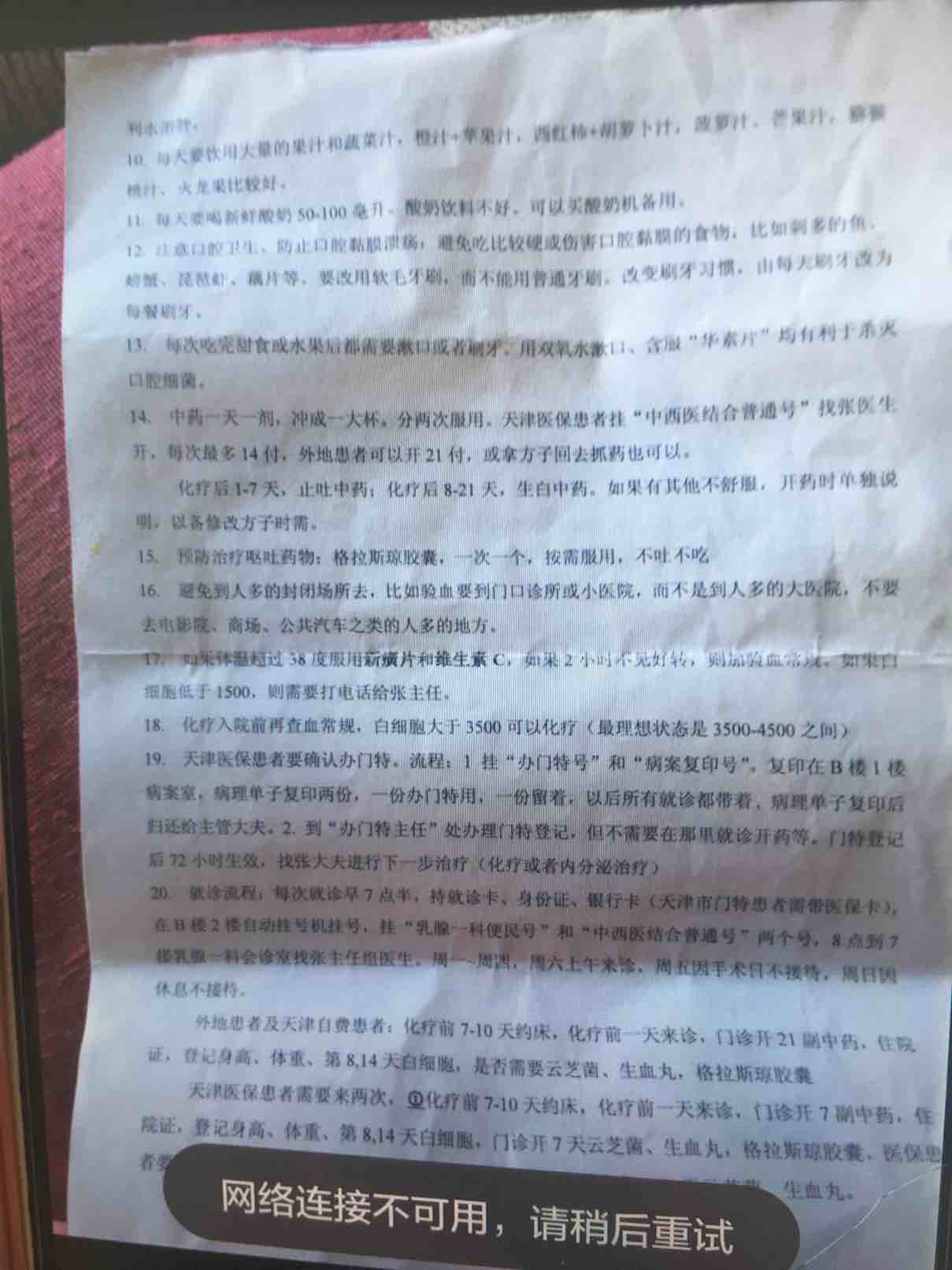 第四次化疗完快一个星期了,吐的不要不要的,喝口水在胃里都存不住,只要吃了东西就得吐了,不然胃里就像排山倒海一样翻滚,化疗前感冒了,化疗后好了,但是咳嗽一直没好,化疗完两天还没事的,但是一直咳嗽,咳的太用力就吐了,药也没少吃,就是不好,昨天咳的后脑勺疼,今天听说吃百香果能止咳,吃了两个也吐光了,感觉太酸味里也不舒服,但是好在咳的少了,现在只有睡着了才会不难受...唉,还有两次化疗,真的是蓝瘦,香菇!