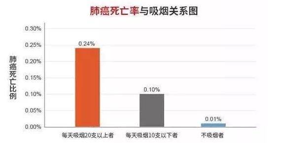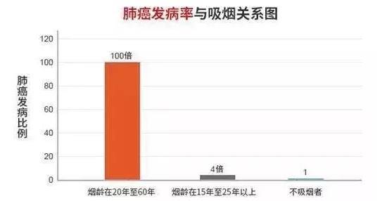 研究人员对100万以上的人群进行了一次大规模对比观察,结果表明:烟龄在15年至25年以上的人肺癌发病率是不吸烟人的4倍,且烟龄在20年至60年的人肺癌发病率比不吸烟人高出100倍。在肺癌的死亡比例中,不吸烟者死亡比例为0.01%;每天吸烟10支以下者为0.1%;而每天吸烟20支以上者为0.24%。由此可见,吸烟和肺癌关系密切,避免肺癌的发生还需戒掉吸烟的不良习惯。