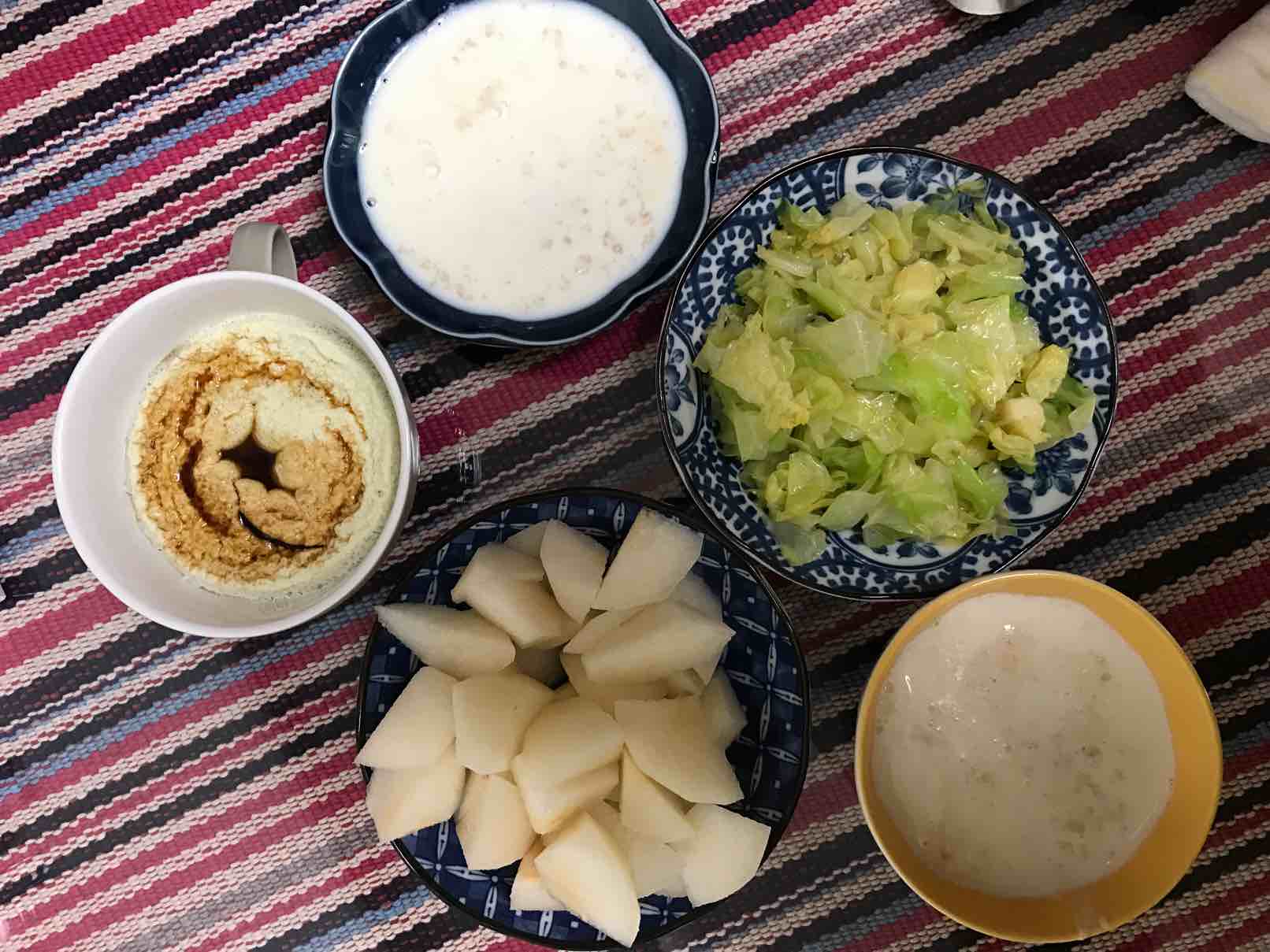 第一次晒早餐,牛奶麦片、美味卷心菜、鸡蛋羹、一盘丰水梨。