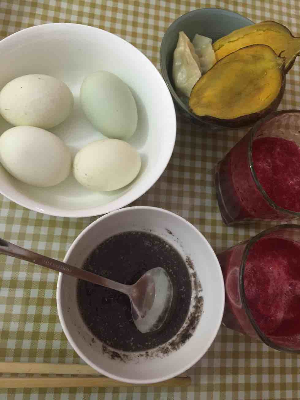 昨晚大哥大嫂送来的咸鸭蛋和红薯。吃了半个红薯一个咸鸭蛋。