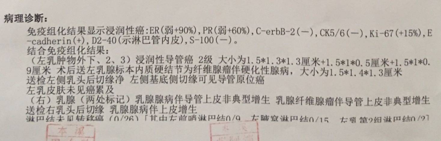 很好的病理,管腔A型,两阳一阴,需要内分泌治疗。估计都不需要化疗。听大夫的,好好配合。