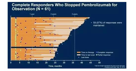 再来看看另外一个PD-1药物Keytruda停药后的数据。ASCO会上报道的另一免疫药物Keytruda的长期随访研究结果表明,KEYNOTE-001研究中患者的3年生存率为40%,中位总生存期为24.4个月,长期客观反应率为33%。在其中因为疾病完全缓解而停药的61例患者中,59例患者(97%)的药效还在继续,他们的中位治疗时间约为24个月,从治疗至出现完全缓解的时间是13个月,停药的中位时间为10个月,中位反应持续时间没有达到,我们可以认为这一完全缓解目前还在持续。