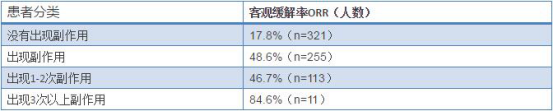 注意的是,研究显示,排除12周内进展的患者以后,PFS(无进展生存期)未见差异!这句话就很重要了,虽然获得缓解,可并没有让患者活得更长久。因此说,在副作用和生存期方面,我们并没有直接证据证实两者呈正相关性。