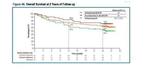 因为停药患者数量较大,所以知晓这部分患者的临床获益情况就显得意义重大。而令人惊喜的是,临床试验结果显示,因联合用药出现毒副反应而停药的一组患者中,总体反应率能达到66%之高(abstract 9518),即66%的停药患者还在持续获益,其中肿瘤的完全缓解率为20%,部分缓解率为46%,病情稳定的患者为17%。停药患者的2年存活率和无疾病进展率分别是71%和52%。