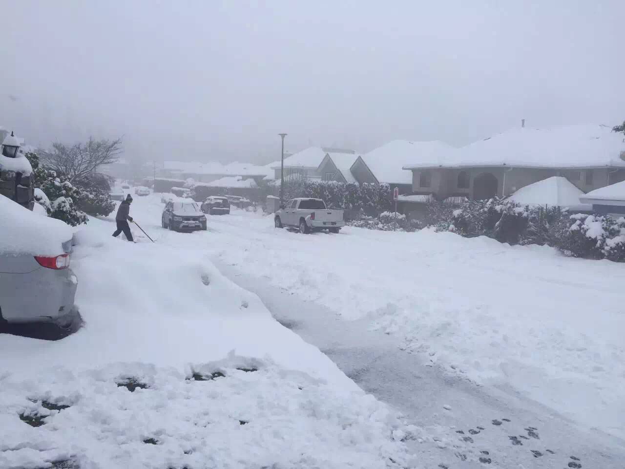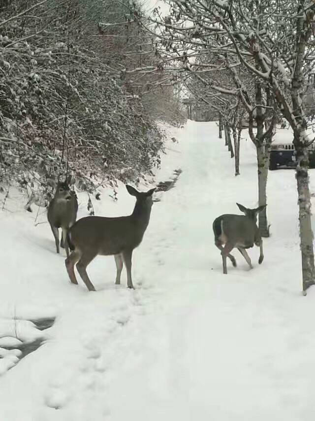 一场多年不遇的大雪让常年居住在四季如春的温哥华的村里人一片手忙脚乱,车开上树的,刚铲完雪就被第二场雪毫不留情的重新覆盖,连山里的小鹿都不失时机的跑出来捣乱交通......