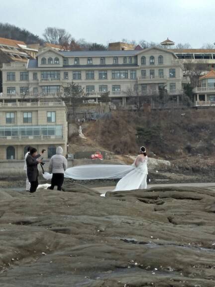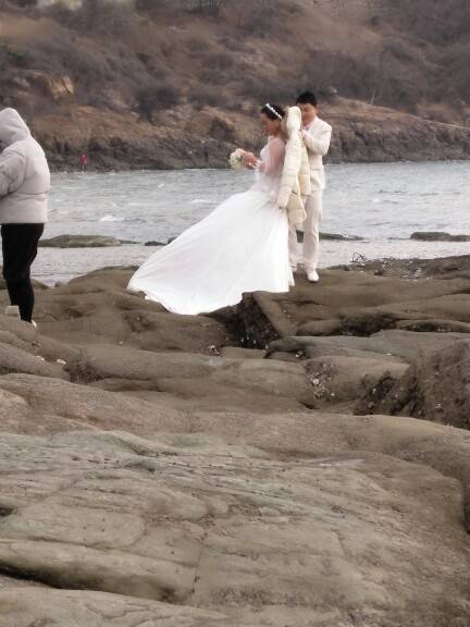 我没看到过大海!好漂亮!美丽的新娘一定幸福满满,心里温暖才不怕冷!