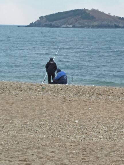 海边有几个钓鱼的人,一位冬泳的老人让我好敬佩,没好意思近距离拍。还有在海边寒风中拍婚纱的新人,好冷啊