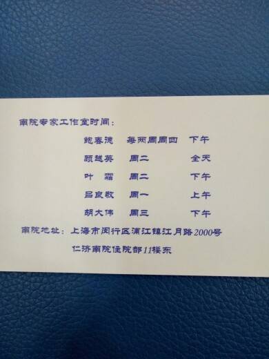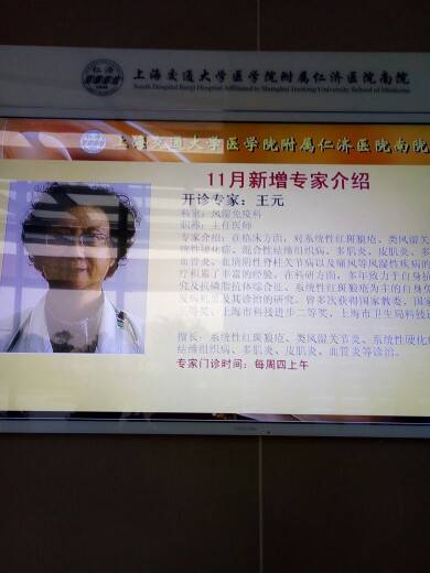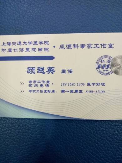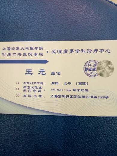 上海仁济南院风湿病科新开专家门诊啦,挂号费只要75元,其中包括王元,叶霜,胡大伟。我上周四去看了王元,拿了她的名片,可以按照上面的电话预约,下面图片上有预约方式,提前一个礼拜预约。我也拿了顾越英的名片,但是很奇怪,王元专家门诊在三楼,顾越英的却在十一楼。看了顾越英的名片背面,发现她联合胡大伟等医生弄了个专家工作室。。