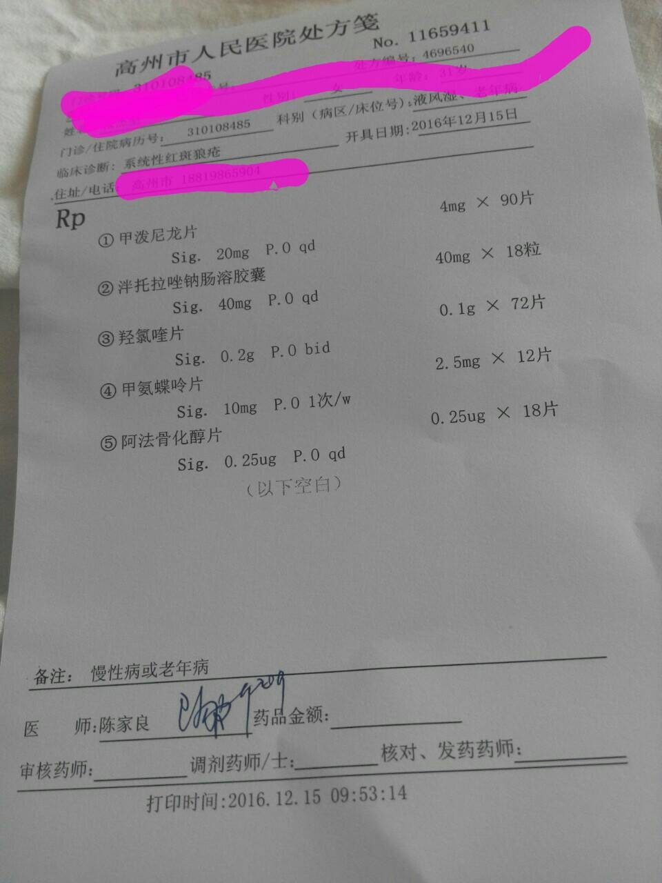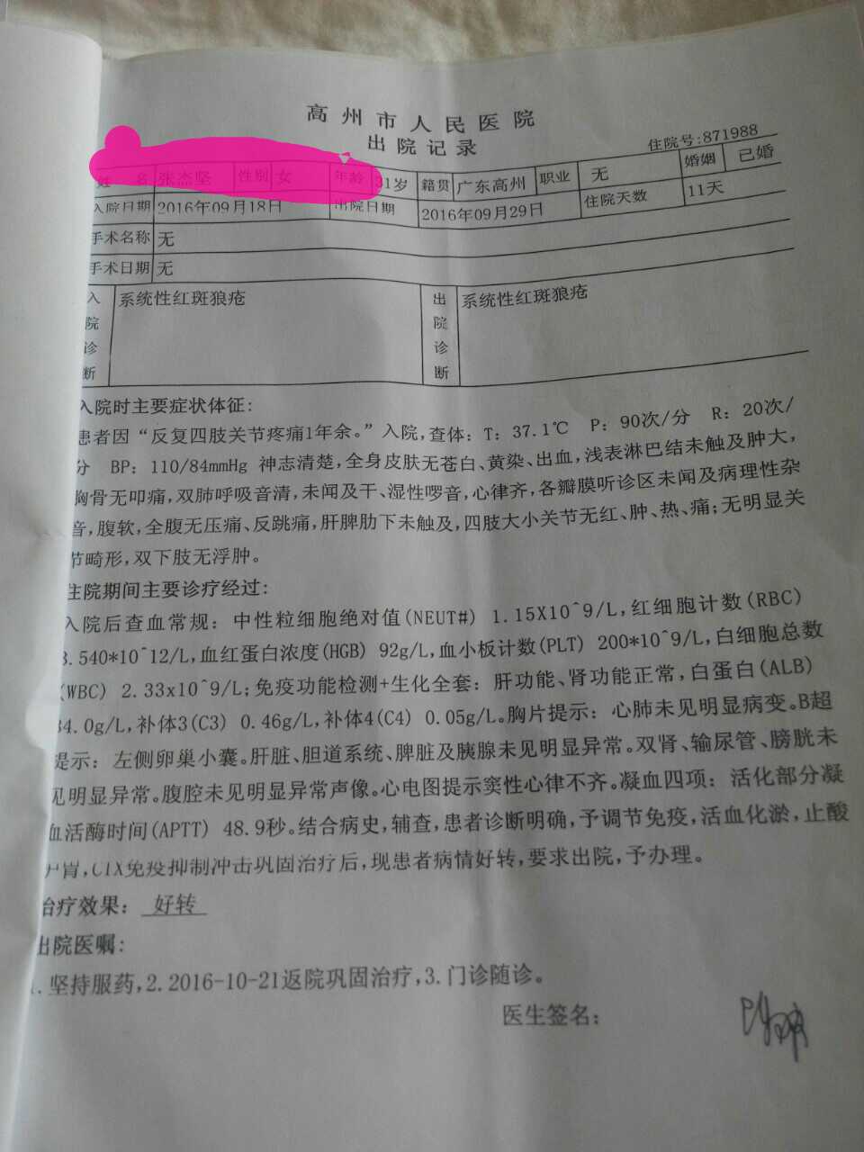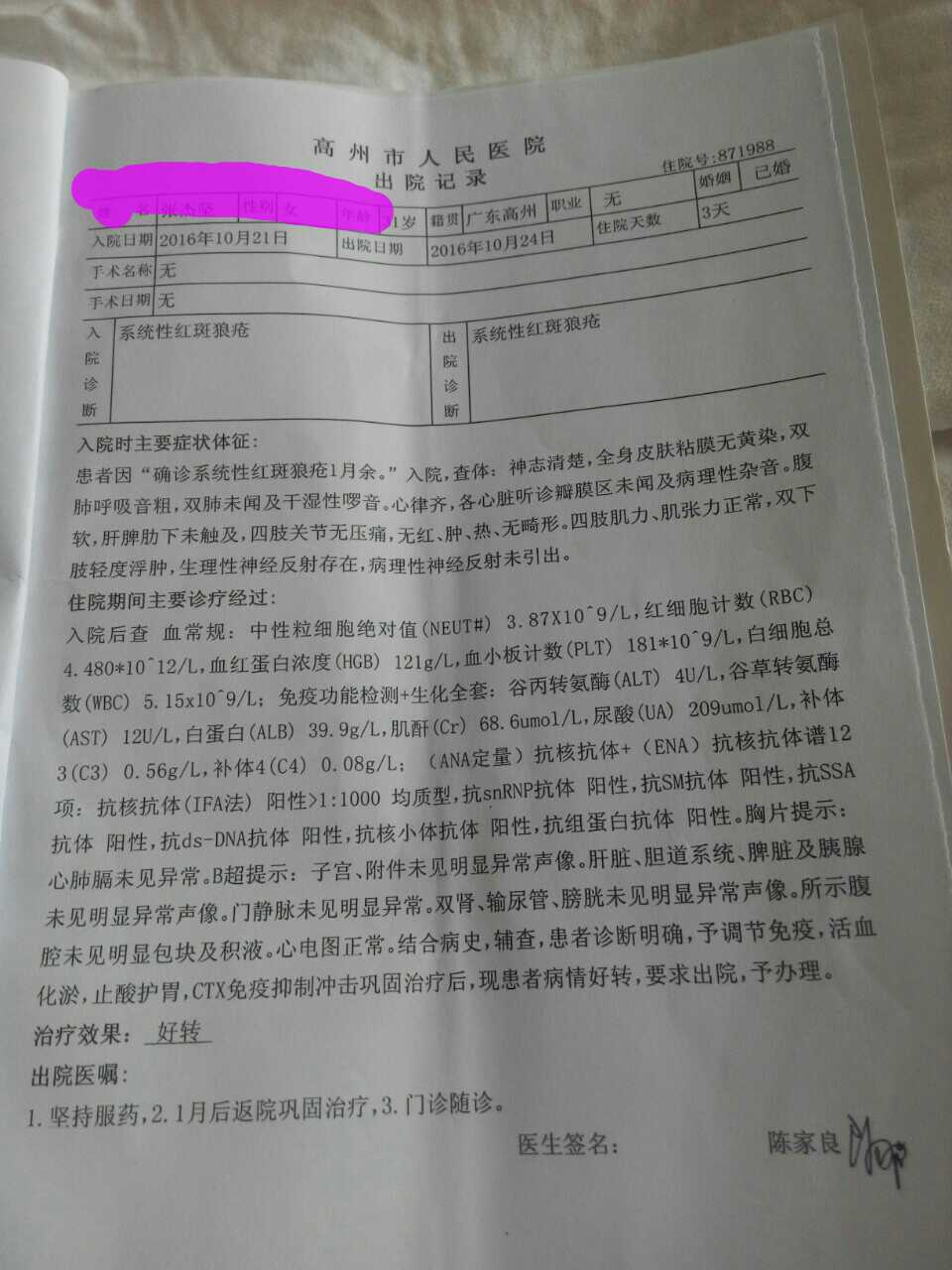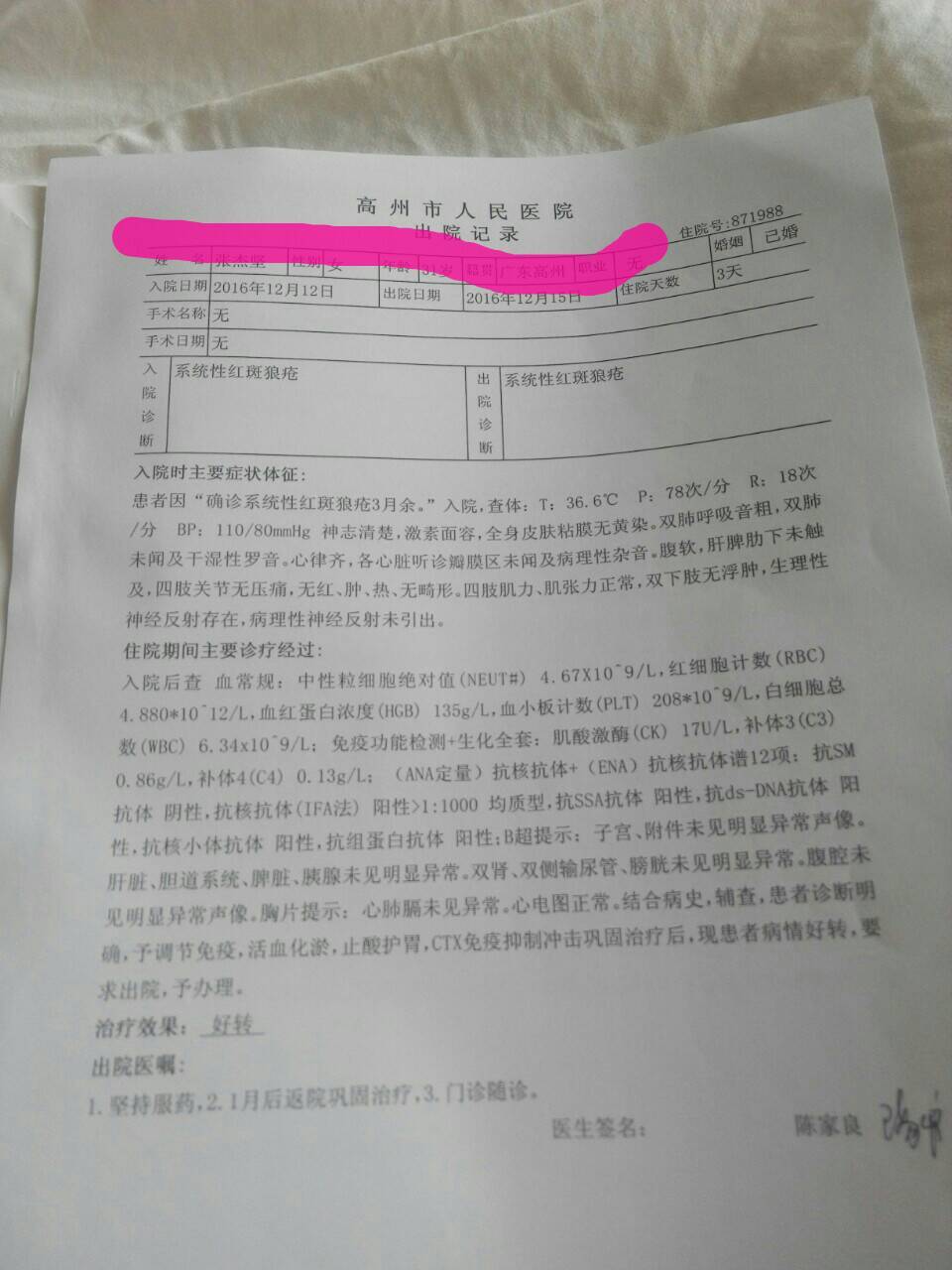 缺药终于来了,去医院打了三天环磷酰胺,今天办理了出院手续,看了三次的出院小结,一次比一次好转,加油,会慢慢稳定,指标慢慢正常…保持好心情,按时吃药…一切都向好的方面发展!