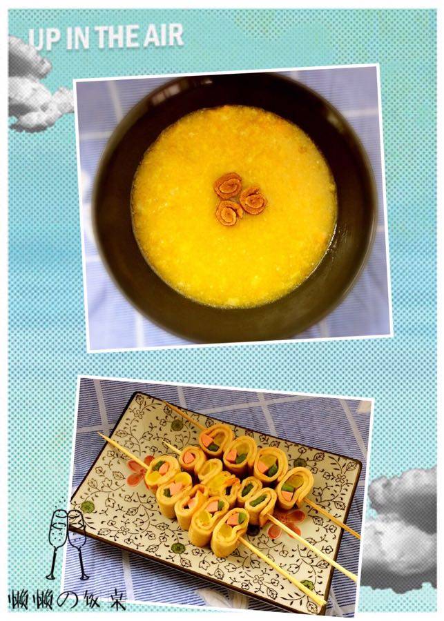 昨天看节目上做南瓜,就看上这个粥了,节目上是说可以快速熬粥,就是南瓜先用料理机打碎再熬粥省时间,米是用米饭。刚好这几天感觉胃有点涨;那个串儿是用鱼饼卷火腿肠,腌萝卜条和青椒条卷的,就像紫菜包饭那么卷