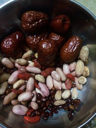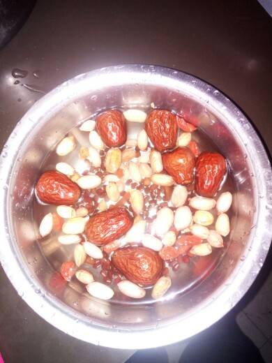 枣和枸杞后放,红豆可多放点,红豆泡了容易煮,花生用红皮花生