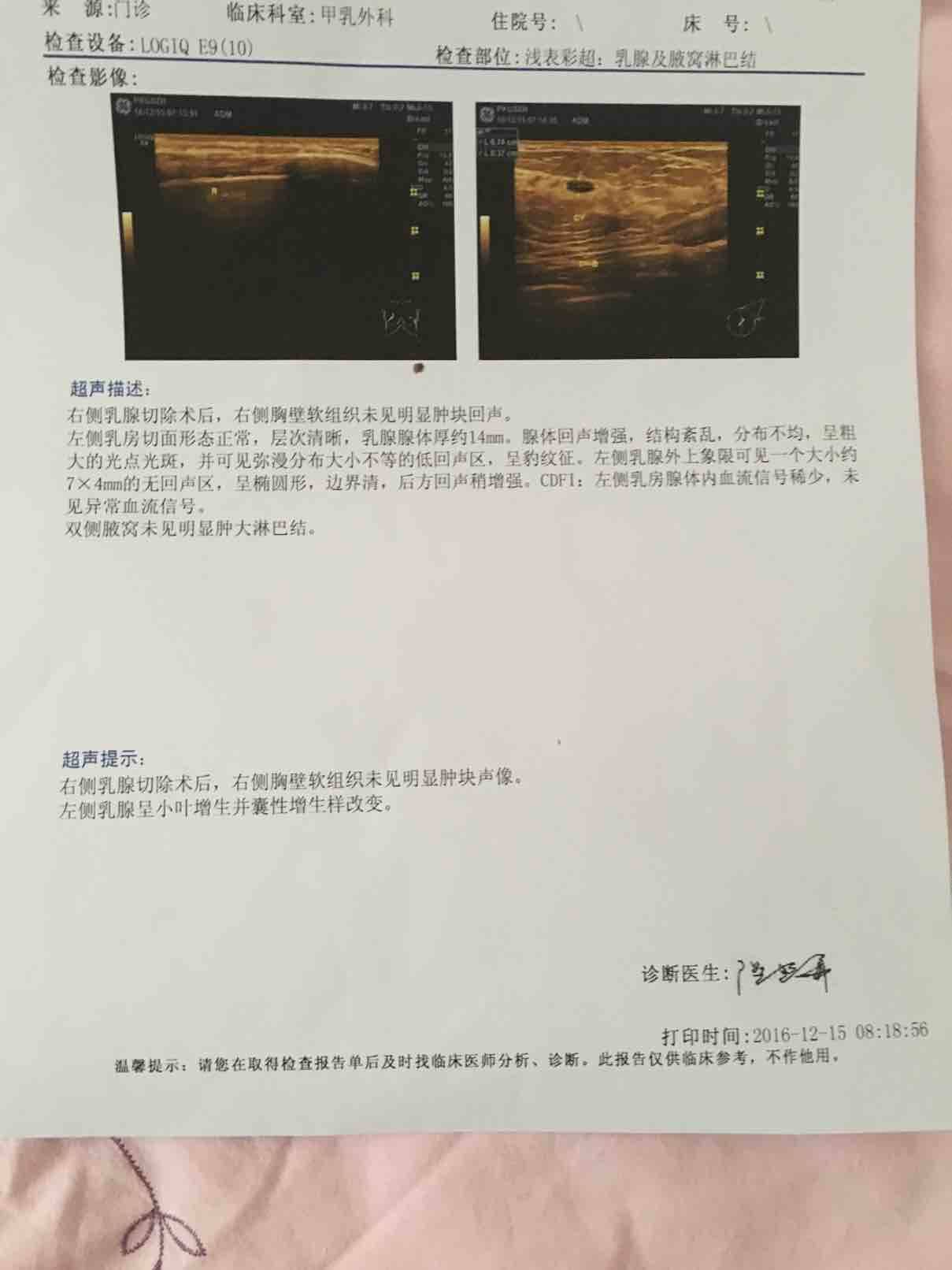 姐妹们这次复查结果挺好的,就是左乳襄性增生7月份检查是4X4,这次是4X7大了许多,做手术2年7个月,就是这次大了,搞得我好紧张,发张图片你们帮我看看呗,也不知道是不是我这几个月吃了鴿子,真怕在长大