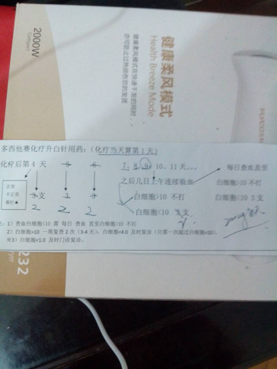 我的医生是建议3以下再考虑打针,平时每天就吃【地榆升白片】,我还一日至少三次五红汤。目前已过了前4疗(红药水的),没有打过一针升白针,最低时候(7天左右时)白细胞在4。