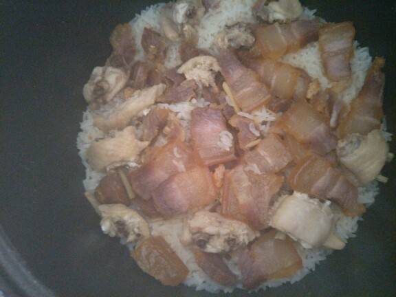 把麻麻晒的腊肉,腊肠,还有鸡翅,剁好,洗好米,泡十分钟,在放腊肉,腊肠,鸡翅在上面,在放点油。插上,正常做饭,好了之后,喜欢葱的,可以剁点葱花下去,乘上就可以吃咯!!!