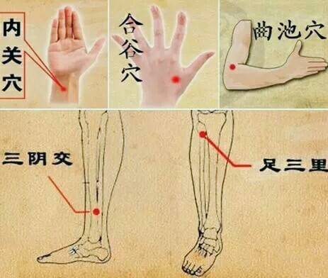 取足三里、三阴交、曲池、合谷、内关五个穴位,每个穴位用大拇指按揉,每个穴位按摩一分钟,两侧都要按到。