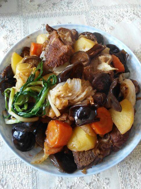 今天是新年的第一天,本来中午是要吃个团圆饭的,可是先生中午单位有应酬,女儿也加班回不来家,先生上午抽空回家给烧了俩个菜,中午又是我一个人吃饭了,团圆饭改到晚上再吃吧,一个排骨香菇大白菜土豆乱炖,一个洋葱烧木耳,一小碗杂粮饭。
