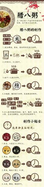 腊八粥制作原料大米50克,黄小米50克,粘黄米50克,糯米50克,秫米(粘高粱米)50克,红小豆100克,莲子100克,桂圆100克 花生米100克,栗子100克,小红枣100克,白糖适量。
