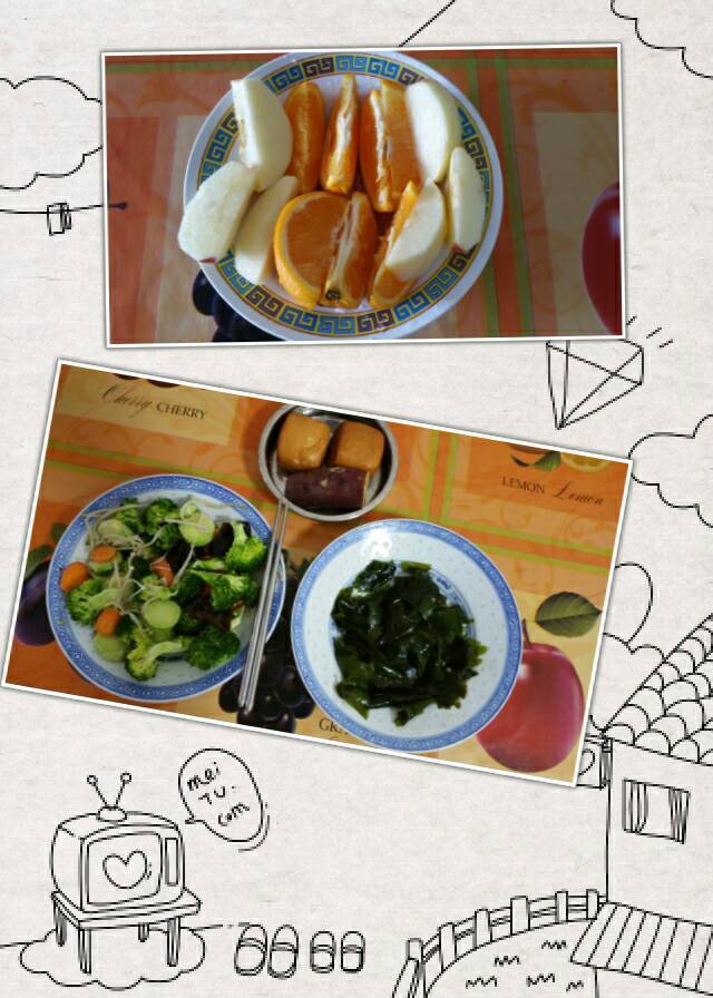 今天的午餐:素炒西兰花金针菇胡萝木耳;凉拌海菜;主食:2个黄金小馒头1个红薯...饭前1盘水果☺