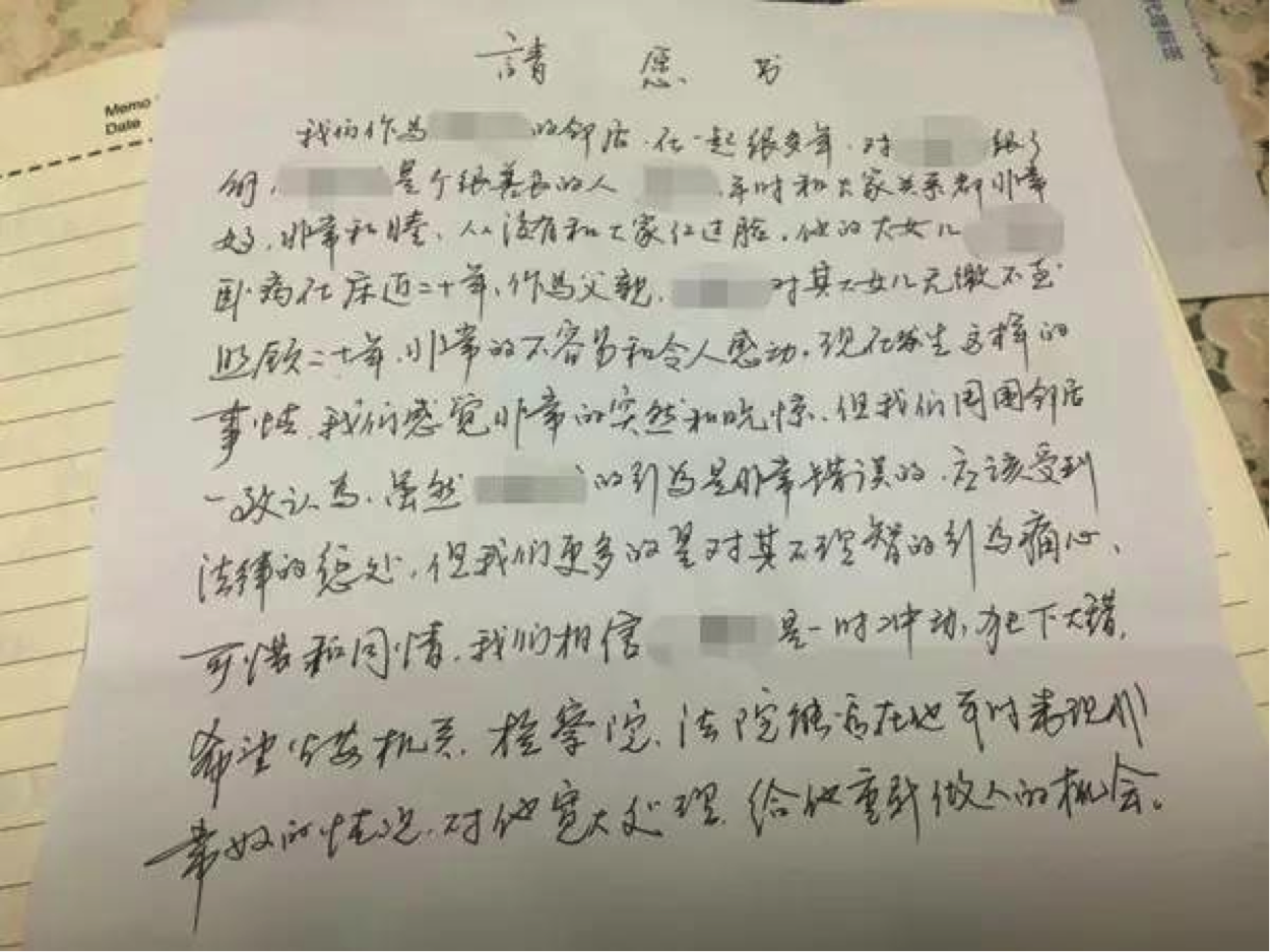 邻居的请愿书。 澎湃新闻记者 于亚妮 图一封“请愿书”里写道,张强的大女儿常年卧床,张强对其无微不至。他们相信他杀女是一时冲动,希望对他宽大处理。