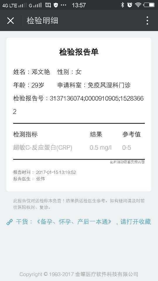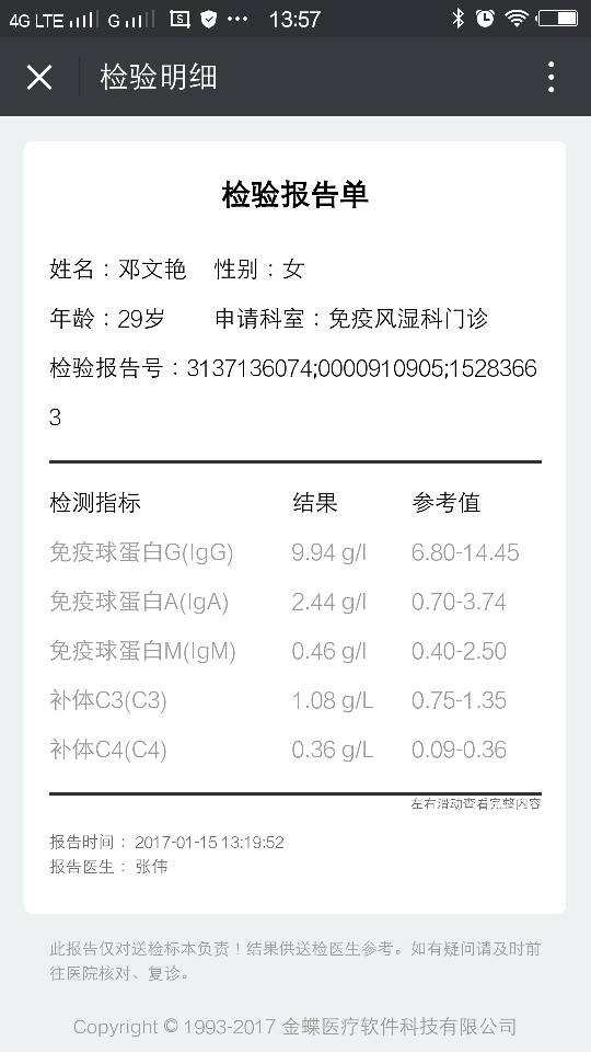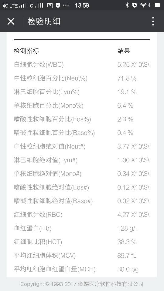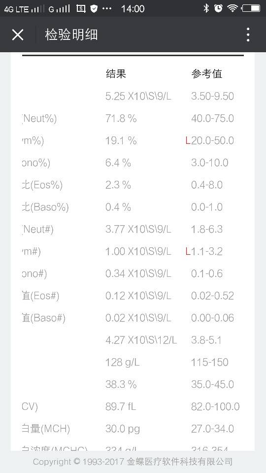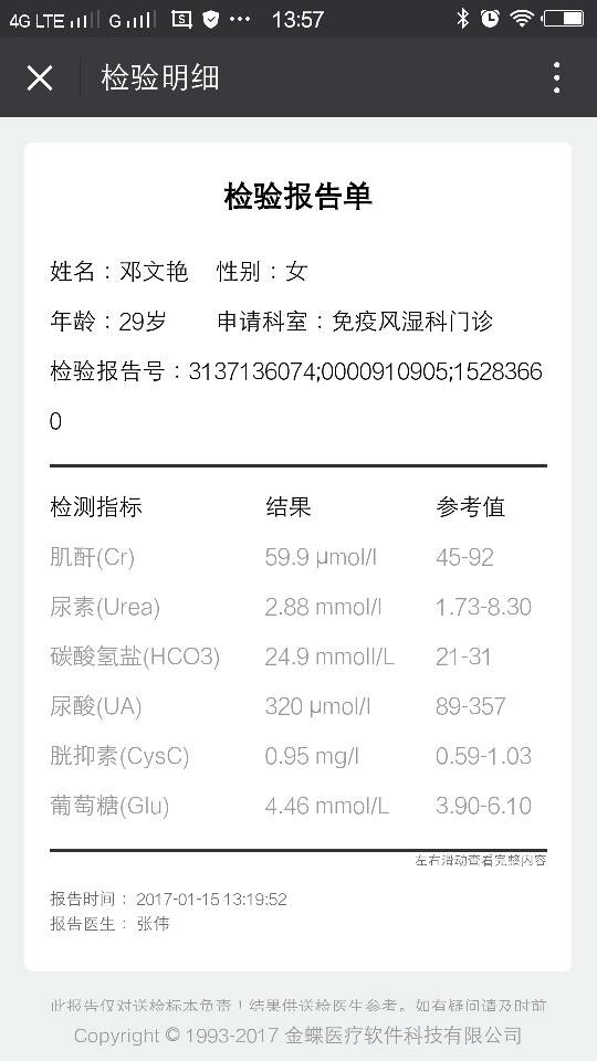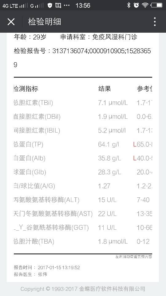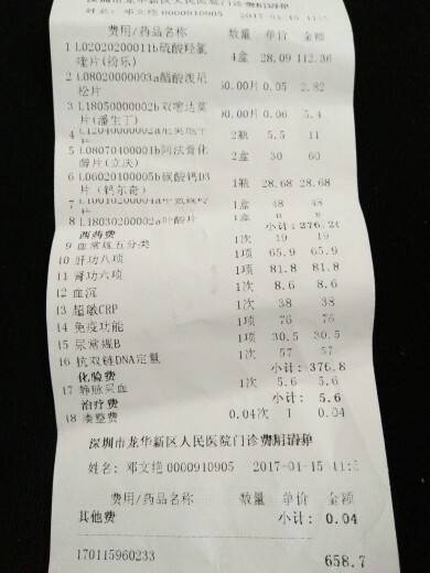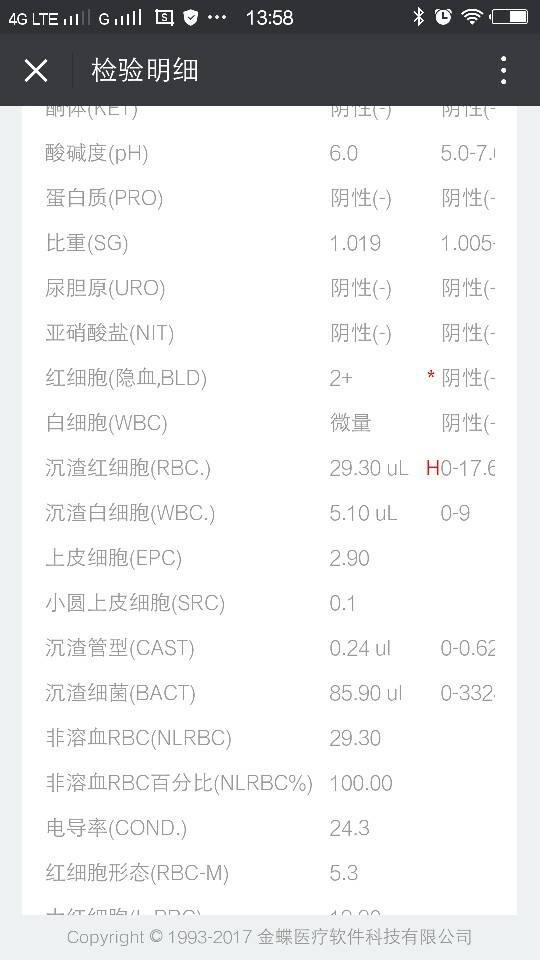 今天本来只想去拿点药备着过年回家的,就起的很迟,后来发现之前要抽血检查的单上次没得报销就没交钱,今天又让医生重新开出抽血检查,检查结果如下,有些我不懂,尿的话可能是快来大姨妈,只有一点点感觉刚开始打算下次再查尿,但给单时一起给医生了于是就一起查啦,还有医生开药时问我哪些要要开,我突然说到那个甲氨蝶林我没吃啦,医生说那个是治你这病的药,怎么停啦,到时复发怎么办,我无语了我说我吃啦几年了没感觉,停啦也没哪里不舒服。然后医生又说那你等结果出来下午再给你调药,后来想啦下说你这个有些结果要明天才出,你明天再来看其他医生再开药,我说我没时间请不到假,医生又说后天呢,我说上班请不到假的,医生你先帮我开那些药吧,后来医生真没法子还是给开啦。