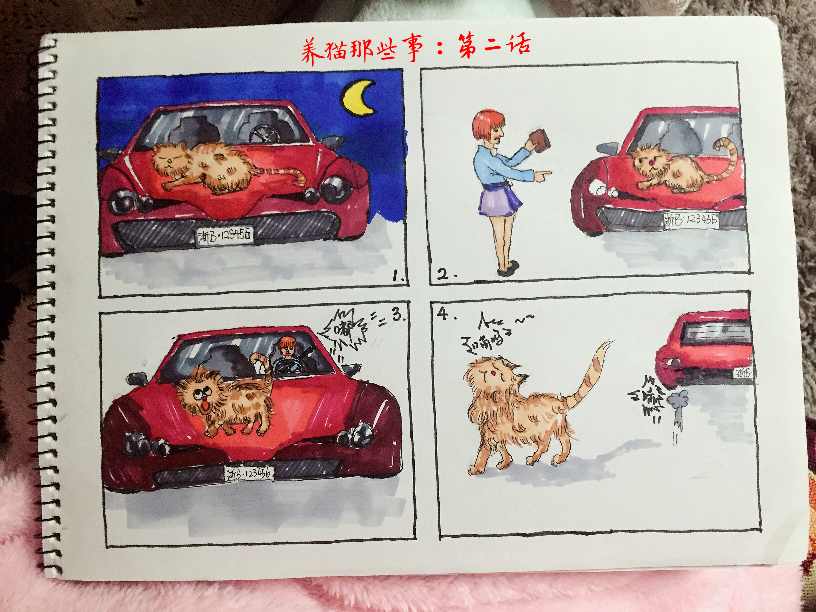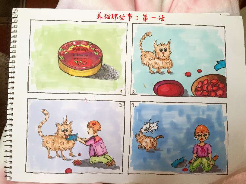 刚才她发来漫画——养猫那些事,说是自己原创的让我开心下。哈😄我看了太搞笑了,蛮滑稽的真不知她怎么想出来的。老公看到了,说这画的什么呀,没全看懂,说她没刻画表达好