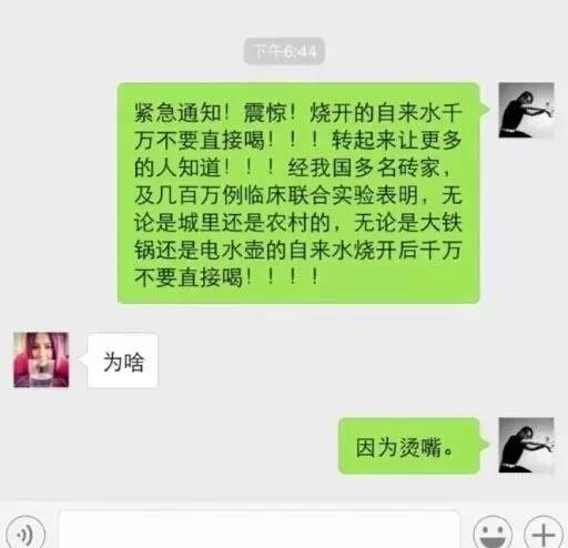 紧急通知: 震惊!太可怕了!烧开的自来水千万不要直接喝,转起来,让更多的人知道,经国内外数名专家及几千万例临床联合实验表明,无论是城市还是农村,无论是大铁锅、电水壶还是饮水机烧开的自来水,千万不要马上直接喝!直接喝的话,烫得很!