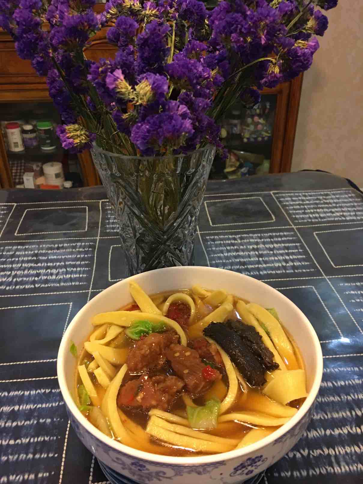都是吃鸭蛋好,可我吃不下去,看美食节目受到启发,今日晚餐用两个鸭蛋和了三两面粉揉成面团,醒一会,擀成面片下锅煮熟,加入青菜,海参,牛肉块,营养价值丰富,天天想着怎么吃才能升白,等到初六去住院,查血就知道效果了!