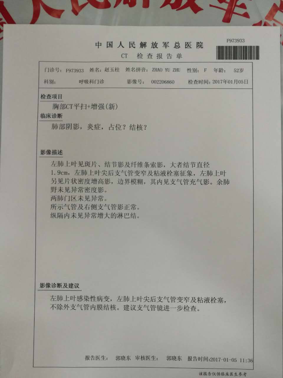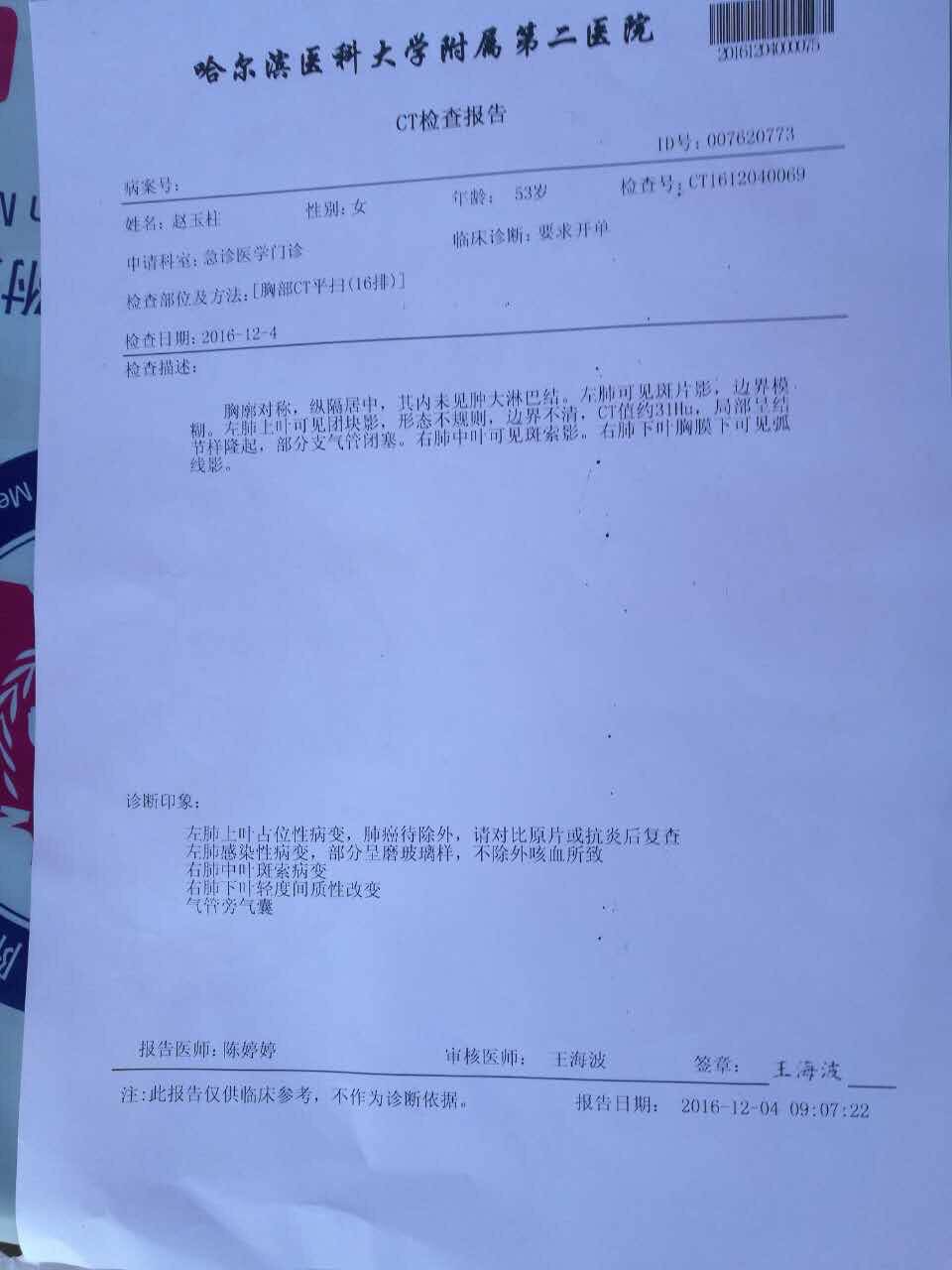 一、初发:2016年11月30日,妈妈摔倒后感冒症状咳嗽,那时刚好一周,在县医院做了个肺部CT,显示左肺部占位,马上带着CT来到哈尔滨医科大学附属第二医院,医生建议抗炎一周再复查CT,但是心里感觉不好,决定去北京301看看。在走之前,12月4日又复查个CT,当时显示病灶没什么变化,还有加重的迹象,但是医生说更像肺结核。马上去301,专家建议继续抗炎,否则从CT看还是不清楚。于是回来抗炎21天。抗炎期间,咳嗽减轻不少。