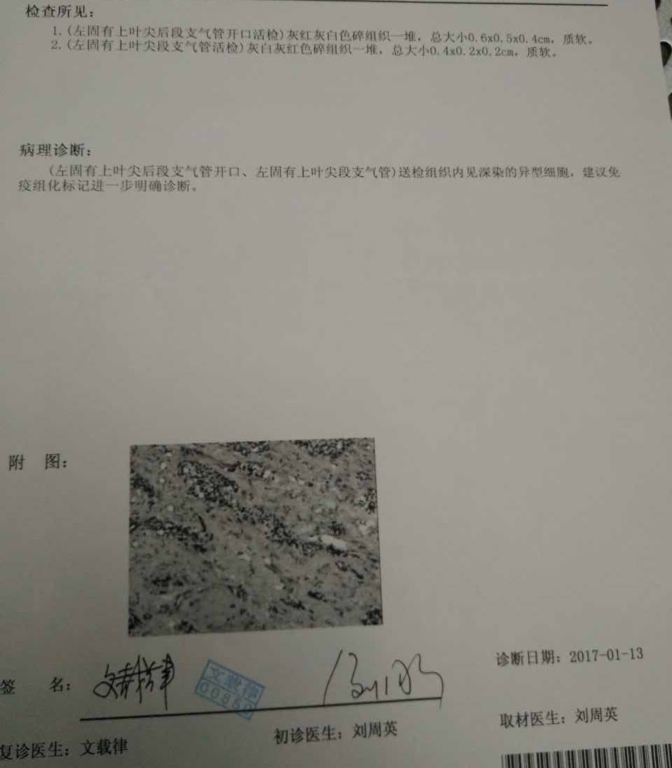 三、确诊:1月10日,做支气管镜,确实有些困难,试了5次才成功。接下来就是等待病理,1月13日,病理结果出来了,建议做免疫组化,进一步确诊,快2个月的时间,真的很煎熬,本以为马上会有结果,又要等待……特别是对于我妈妈来说,心里两个声音一直在打架,是肿瘤?不是肿瘤?无论从哪个状态来看,她都不像是癌症患者,不咳嗽了,也没有消瘦,没有浑身无力。可一天没有结果,就难以放心。这几天,免疫组化结果出来了,爸爸一直瞒着我,我偷偷地打开了爸爸的手机,当看到“小细胞癌”这几个字,真的崩溃了……在此之前做足了很多功课,知道这意味着什么,马上要过年了,爸爸一定是想让妈妈好好过个年,年后再去北京。妈妈心里一直抱有一线希望,会有奇迹发生。可是,老天不眷顾这个诚实善良的妈妈,非要让她得了这个病。真的不知道怎么告诉她这个事实……