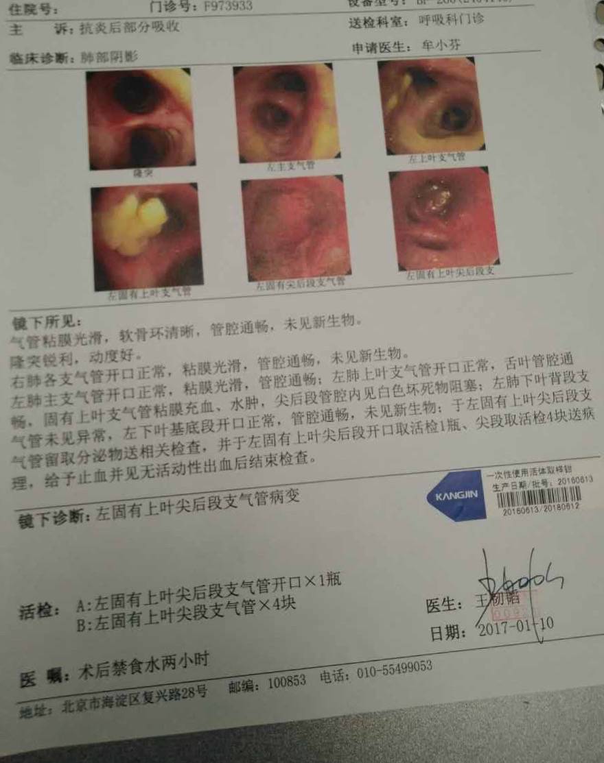 二、纠结:虽然去了北京一趟,但总感觉没这么简单,怕是肿瘤耽误了。抗炎这期间,又在哈尔滨医大二院做了个CT,专家会诊后说建议回家等待,再过几个月再复查。还是感觉心里不托底,因为也大夫怀疑肺结核,又去了专门的结核病医院,肿瘤鉴定科和结核病科看了301的检查结果,那时肺结核检查都是阴性,一个专家说她有个患者也是这情况,但是做病理却还是肺结核。我们又燃起了希望,希望是肺结核。而且这两个科室都建议做支气管镜查病例,说这样能有结果,比较清楚。在是否做支气管镜的问题上,医生意见也不一。去肿瘤医院,专家说那个位置怕够不到,她也说看着不像肿瘤,像肺结核的位置。她又给找了一位省医院肺结核的专家,问问能否肺结核治疗方向,但是这位专家建议还是要做一下支气管镜。这时也快到北京复查的时间了,当时这么想的,如果是肺结核那如果不治疗,耽误事。如果真是肿瘤,更耽误事。于是决定去北京301复查,看看大夫怎么说,如果让做支气管镜,不管是否困难,那都要做。到了北京301做了个CT后,CT室建议做支气管镜。