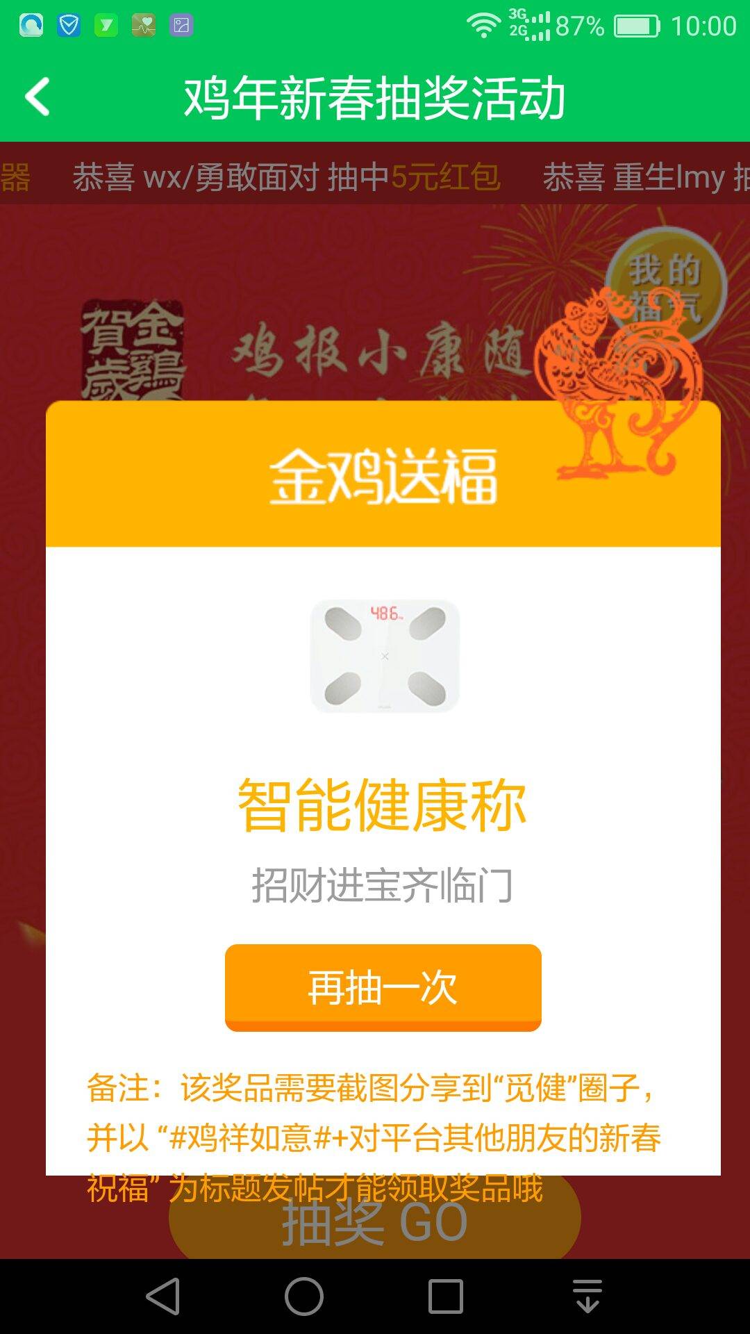 今天年初三,进觅健抽了个智能健康称,保持健康的体态有利于后期康复,谢谢觅健君,2017年愿一直与觅健相依相伴,祝觅健的姐妹们:🐔年吉祥、身体健康、快乐相随!