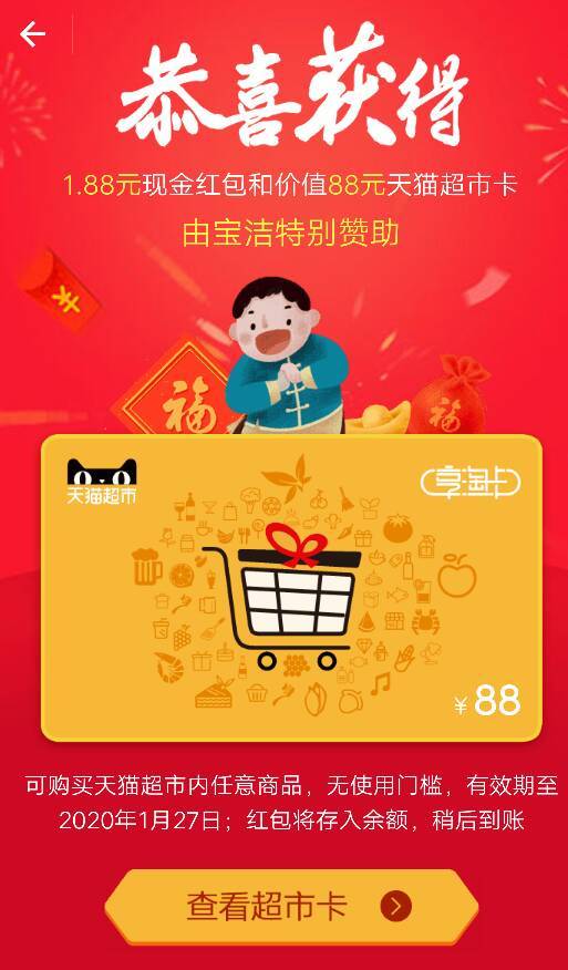 真不错,五福开奖居然还有超市代金劵?