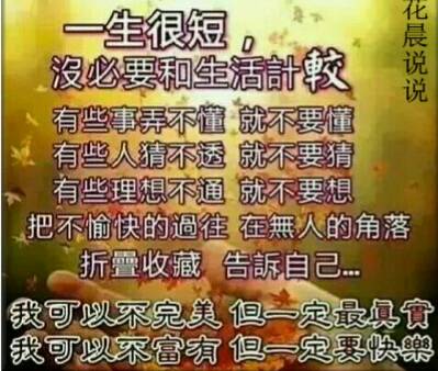 生病前为了讨生活而忙碌着从没去想到这个问题,明天是自己生病住院确诊后至今刚好一年的时间,慢长的2016总算走完了其中的酸痛和种种磨难不言而喻,历历在目,总想淡忘却真是心不由已。但现如今不得不思考人生……人啊,活着活着就老了,剩下的时间真没多少了。钱啊,挣着挣着就没头了,真等死那天都成废纸了。情啊,处着处着就淡了,想要珍惜的时候都再见了。心啊,作践作践就昏暗了,真到开窍时人就完了。父母是对我们最好的,要孝敬点儿;爱人是一辈子相伴的,要体贴点儿;朋友是帮我们最多的,要珍惜点儿;家庭是最离不开你的,要用心点儿。路是自己选的,要慎重点儿;事是自己做的,要认真点儿;命运是无常的,要看开点儿;烦恼是自找的,要躲开点儿;健康是重要的,要矜贵点儿;脆弱是难免的,要坚强点儿;坎坷是必然的,要勇敢点儿;心情是自己的,要愉悦点儿。你再优秀,也会有人把你打入冷宫;你再平凡,也会有人把你视若生命;你再善良,也得碰上知恩图报的人;你再让步,也得碰上知书达理的人。所以:懂你的人别放开,不懂的人请离开;真心的人用心待,无心的情别依赖!用心数数,我们的生命都已经进半。喜欢的就陪伴,讨厌的就离远,开心的就多看,伤心的就不见。掐指算算,以后还有多少时间,够我们浪费,够我们消遣,够我们作践,够我们感叹。好好地活着,简简单单过好生命中的每一天!我们是应该改变一下从前的自己2017年重新开始新的生活。