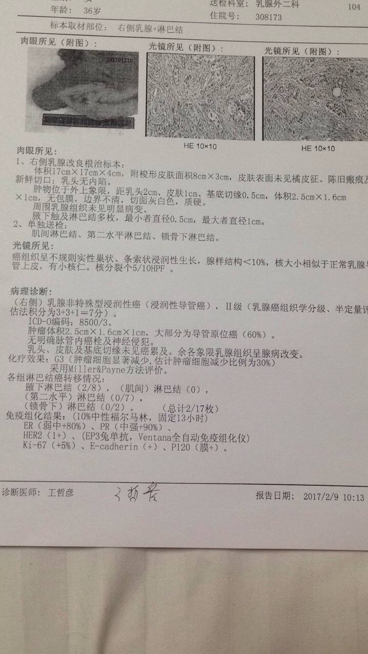 术前四次红药水化疗,2017年2月6日做的手术,大病理出来了,术后化多西四次,姐妹们看我怎么样?