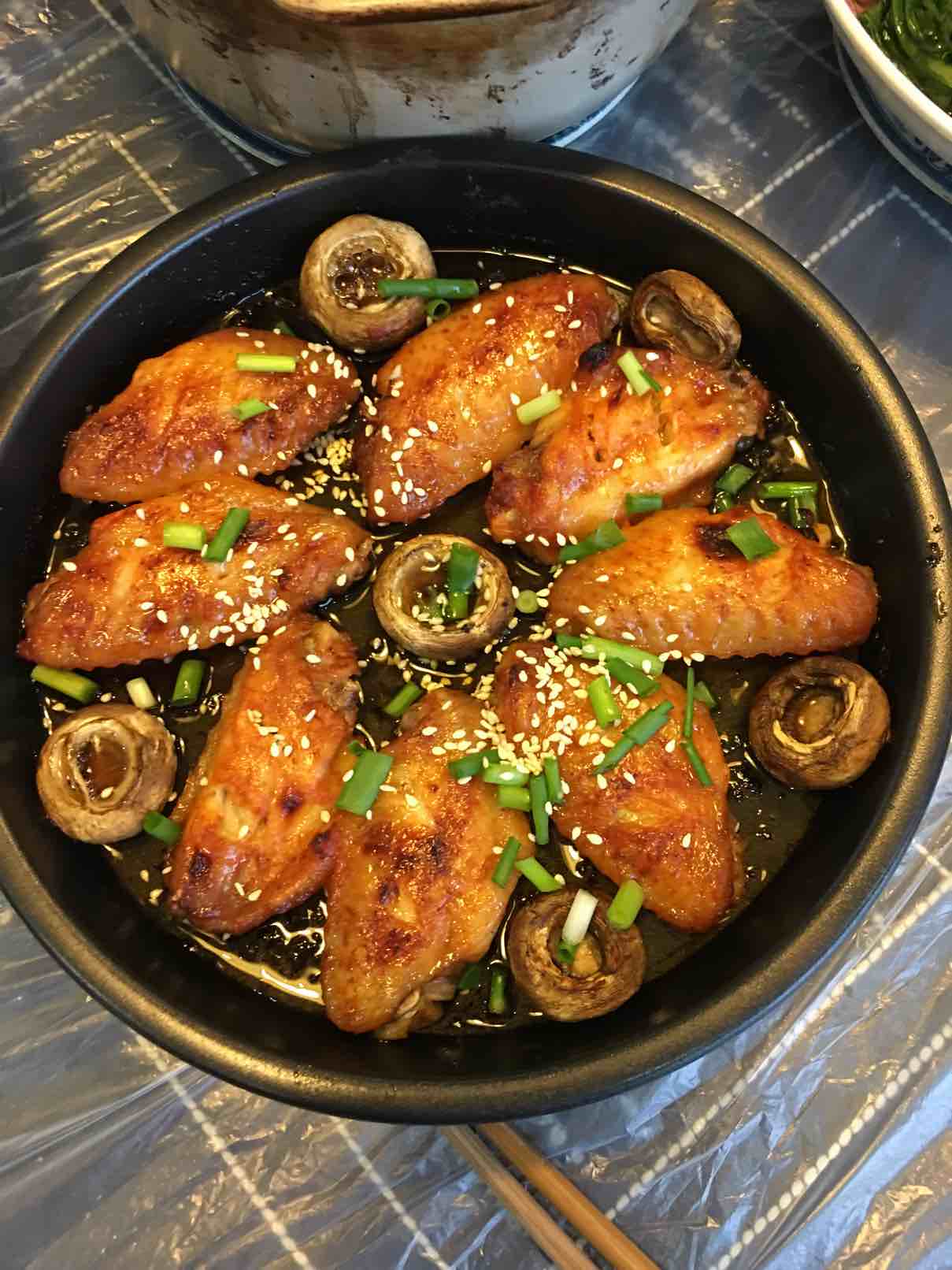 买一袋新奥尔良烤翅佐料,将超市购买的鸡翅洗干净正反各划两刀入味,放冰箱腌制一晚上,烤盘刷油依次放入鸡翅,表面刷一层油和蜂蜜,两百度烤十五分钟,取出翻面刷一层油和蜂蜜,再次烤十五分钟,两面金黄酥脆,完胜个大餐厅同类菜品,关键是自己做的放心!剩的几个蘑菇烤出来也香甜可口!
