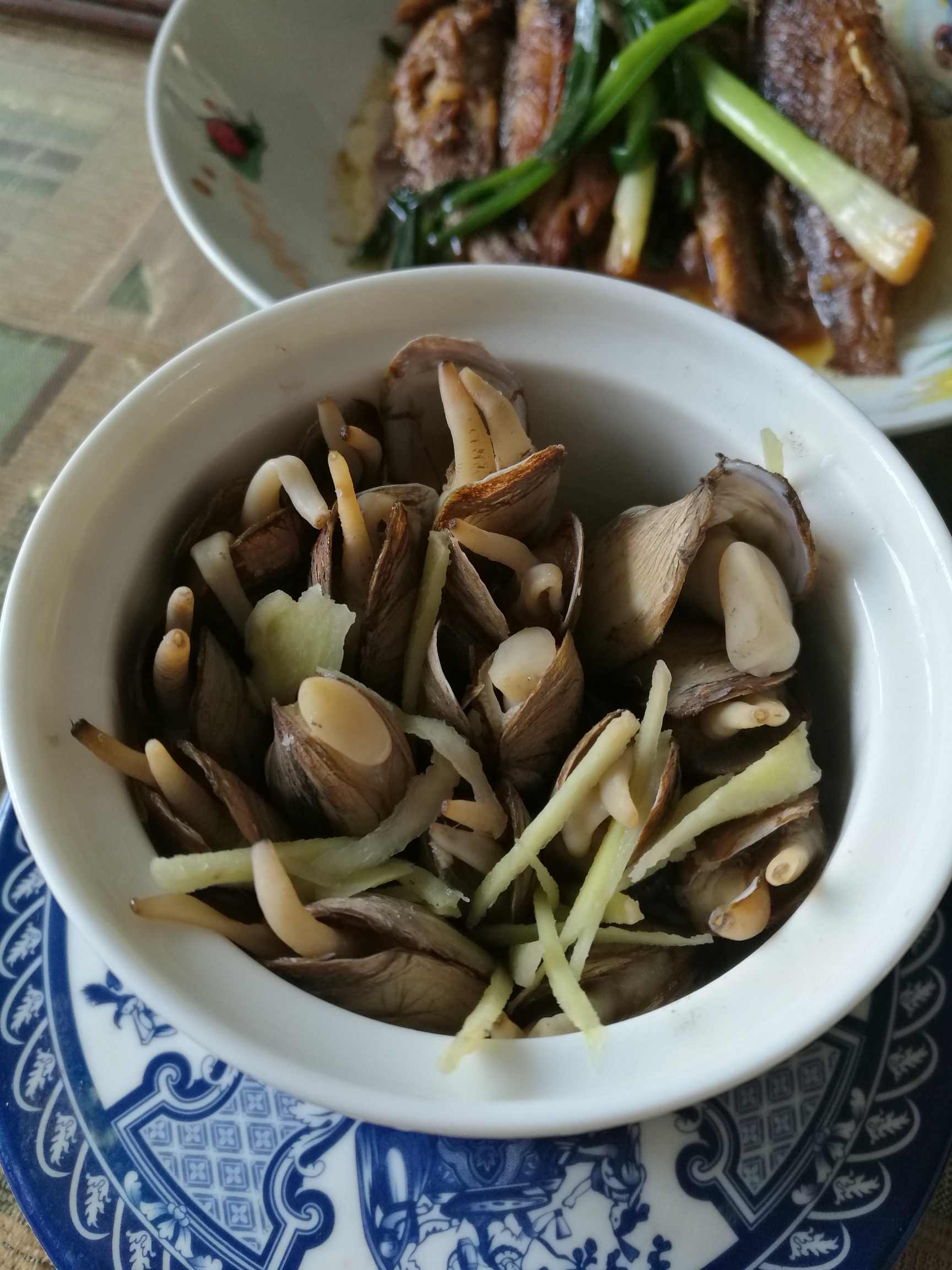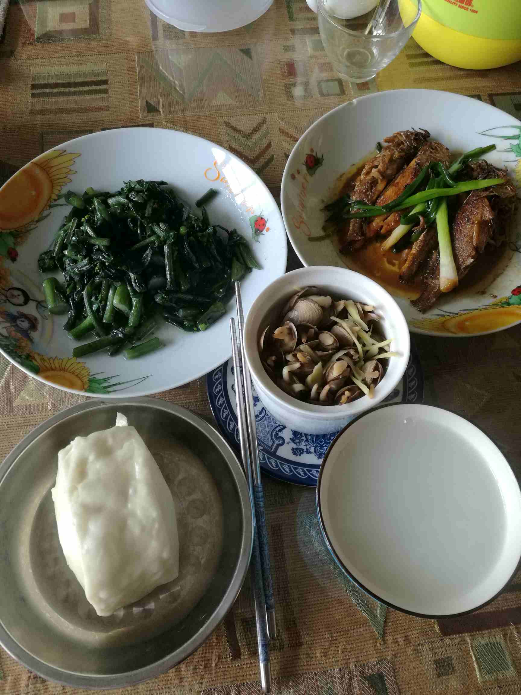 原汁原味插蛏,红烧小梅鱼🐟,还有很漂亮的一炒就变色的紫色菜心,外加一个东伊顺馒头和粥,不过馒头实在太大只能吃半个。说要吃素了今天又是海鲜,改不掉的坏习惯,哎😭