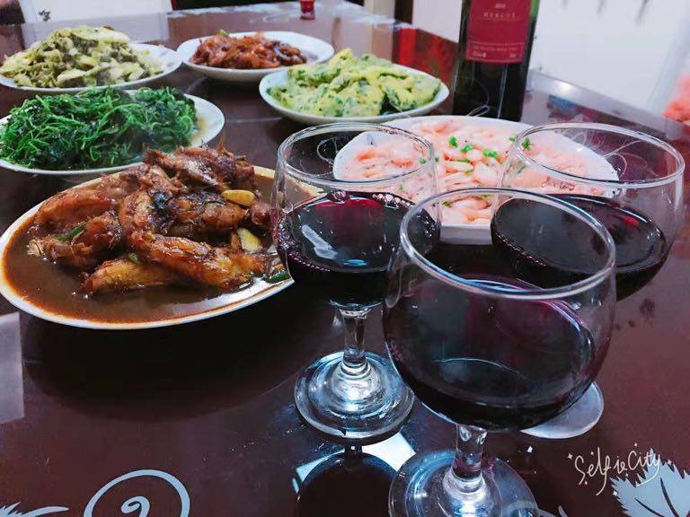 丰盛的菜,还有红酒,开心每一天。