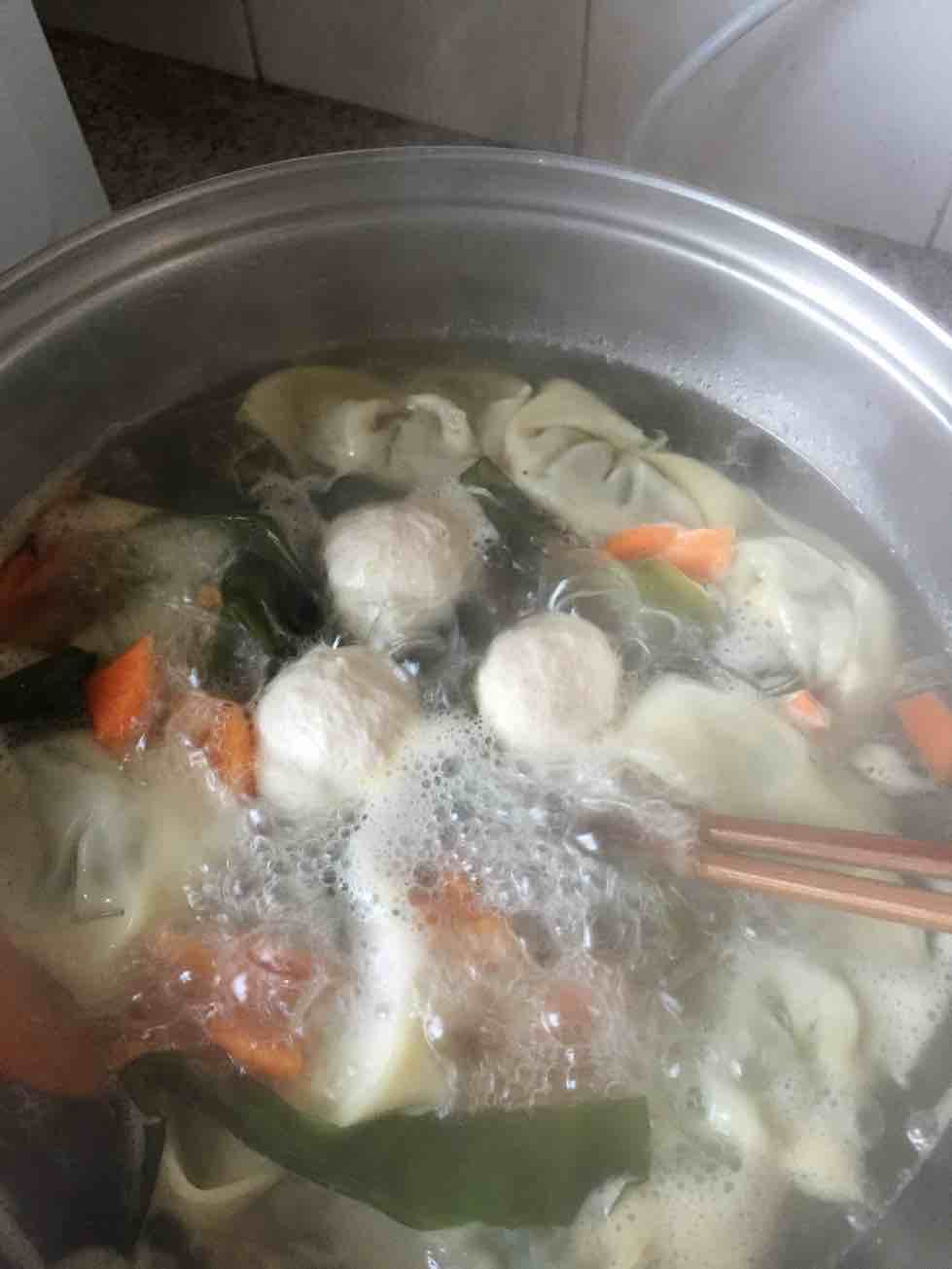 我今天也是一锅端。木耳肉馅馄饨,用西红柿  黄花菜 甘蓝 菠菜呛锅