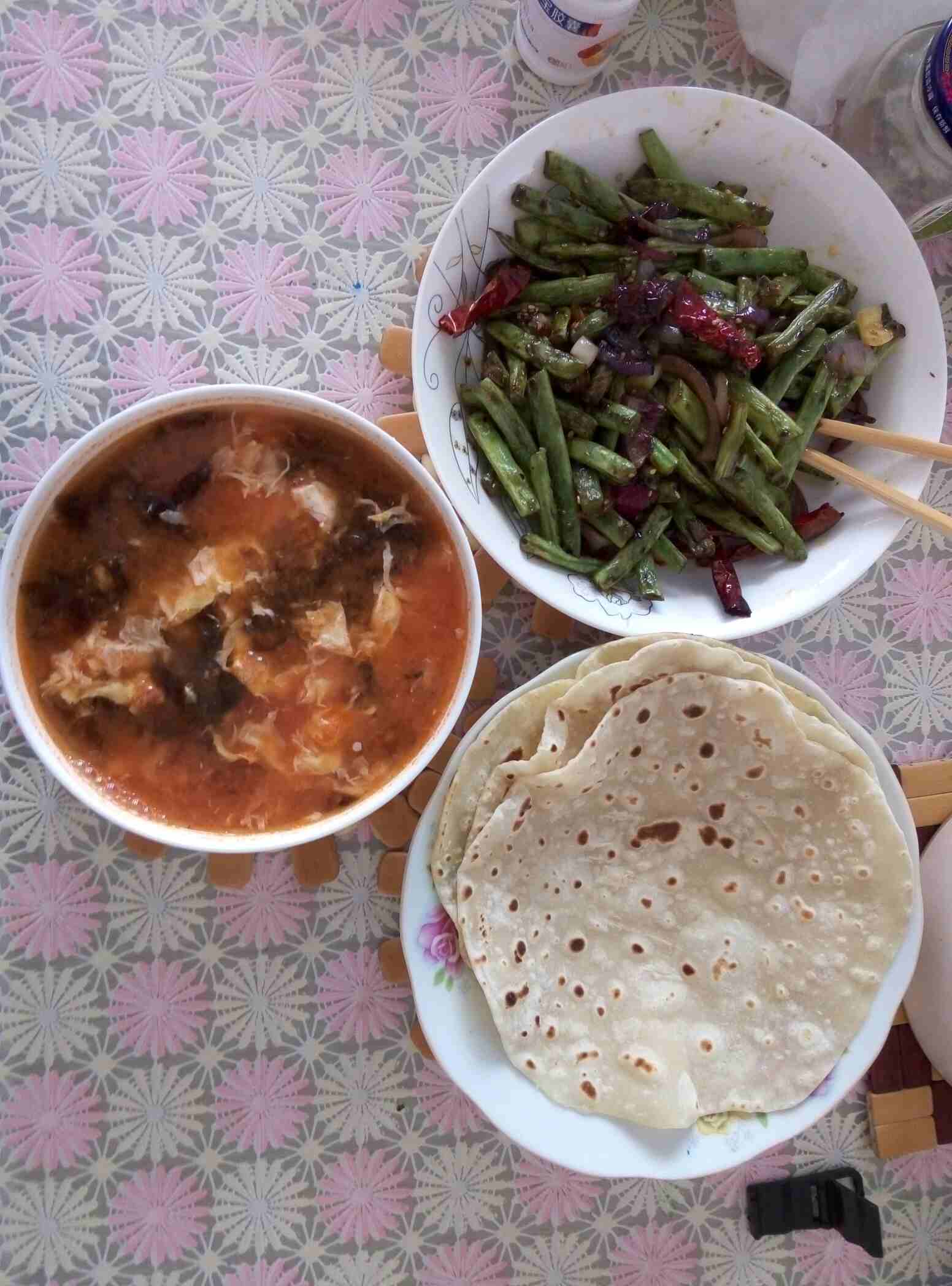 中午时间紧张,做了干煸豆角,西红柿紫菜蛋汤,白面饼(提前做好冻冰箱的饼)。