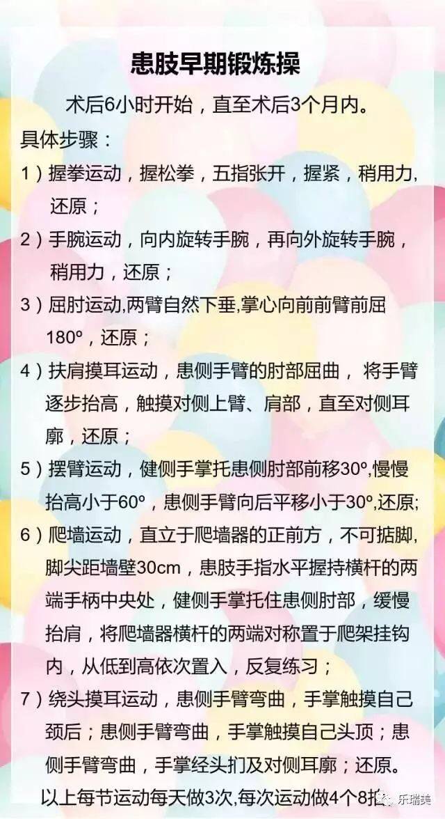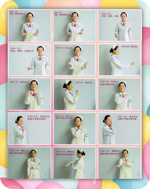 术后患者要积极有效的早期锻炼患肢,遵循循序渐进的原则,通过手臂运动,肌肉收缩,促进血液和淋巴液回流,促进伤口愈合,恢复患肢功能,亦可防止淋巴水肿。