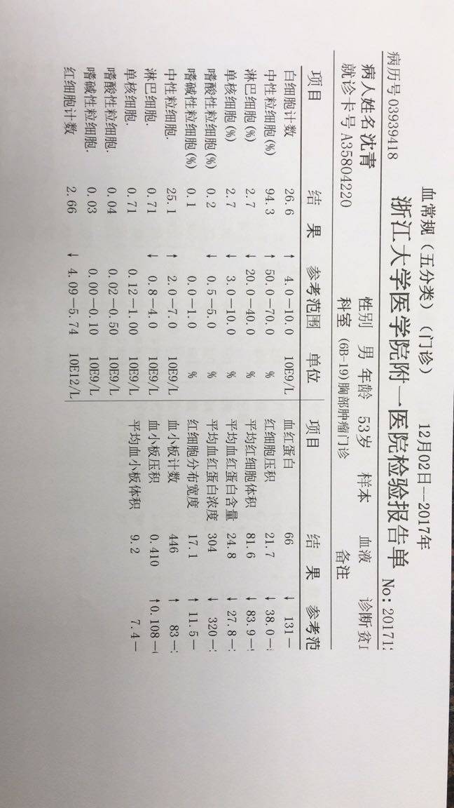 这是今天的血常规,指标全线下降啊