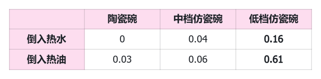 之前,有一个实验[1]用陶瓷碗、中档仿瓷碗(10多元)和低档仿瓷碗(3元)盛放热水、热油,比较了靠近碗口处的甲醛值。