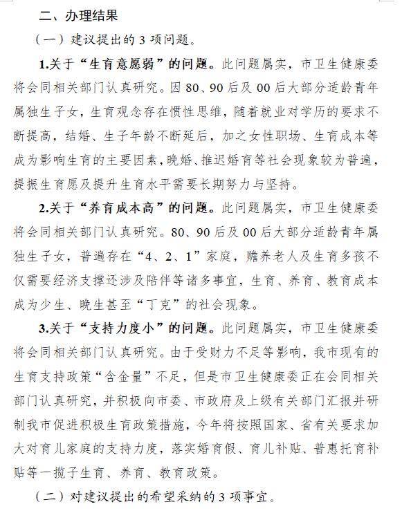今年我提的是关于建立生育支持政策的建议。不说大城市,仅就我身边的年轻人而言,不说生育,就连结婚谈恋爱的也越来越少。大城市小地方的生育率这几年都持续走低。生育一头连着千家万户的民生幸福,一头连着经济社会的持续发展,而生育愿意弱,养育成本高,再不出台支持生育的政策,可能再过几年小学都招不到生了。