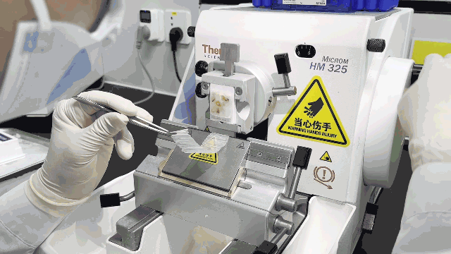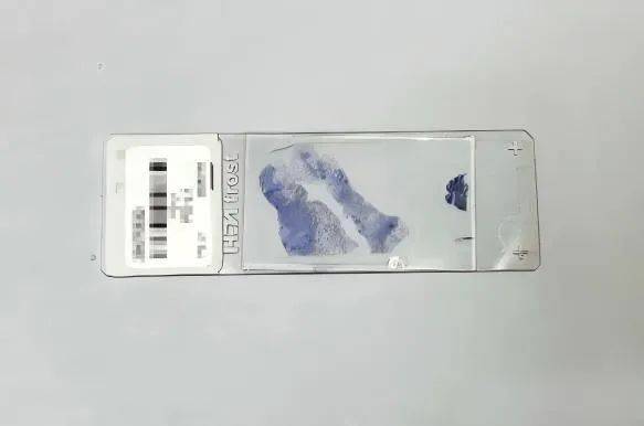 每个蜡块可切出很多张石蜡组织切片,类似于将冰冻羊肉切成薄片的加工过程:将蜡块固定在切片机上,切成厚度仅3-5微米的超薄切片,再将其铺在特制玻璃上,形成“玻片”。这种未经染色处理的切片,就是我们所说的“白片”,完成切片通常需要数小时,切片的本质是为了便于后续的染色、观察及其他检测。