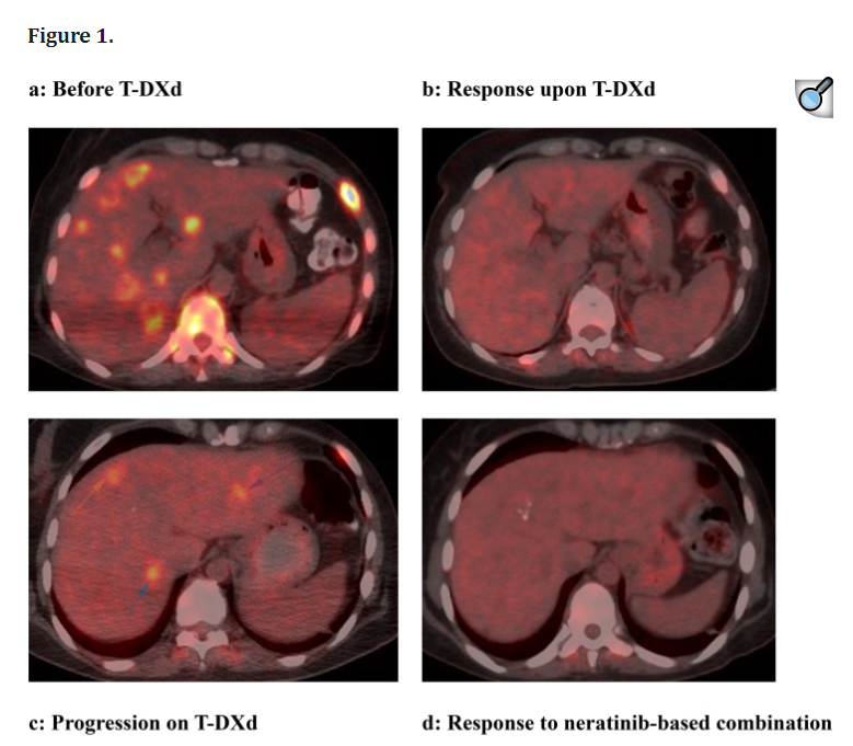 2025年发表于《Frontiers in Oncology》[3]的一例38岁HR+(激素受体阳性)、HER2阳性伴骨转移及肝转移的乳腺癌患者,在经历多种抗HER2治疗后出现耐药。基因检测显示ERBB2扩增及多种耐药突变。初始使用DS-8201实现近完全缓解,疾病进展后换用奈拉替尼联合氟维司群和紫杉醇,再次实现显著缓解,且耐受性良好。